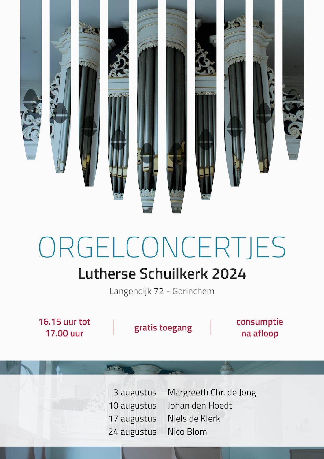 Ook in augustus 2024 wordt er een concertserie onder de naam ‘Orgelconcertjes Lutherse Schuilkerk Gorinchem’ in de Gorcumse schuilkerk georganiseerd. Het derde concert van deze serie wordt verzorgd door de jonge organist Niels de Klerk. Hij is cantor-organist van de Oude Kerk in Naaldwijk.